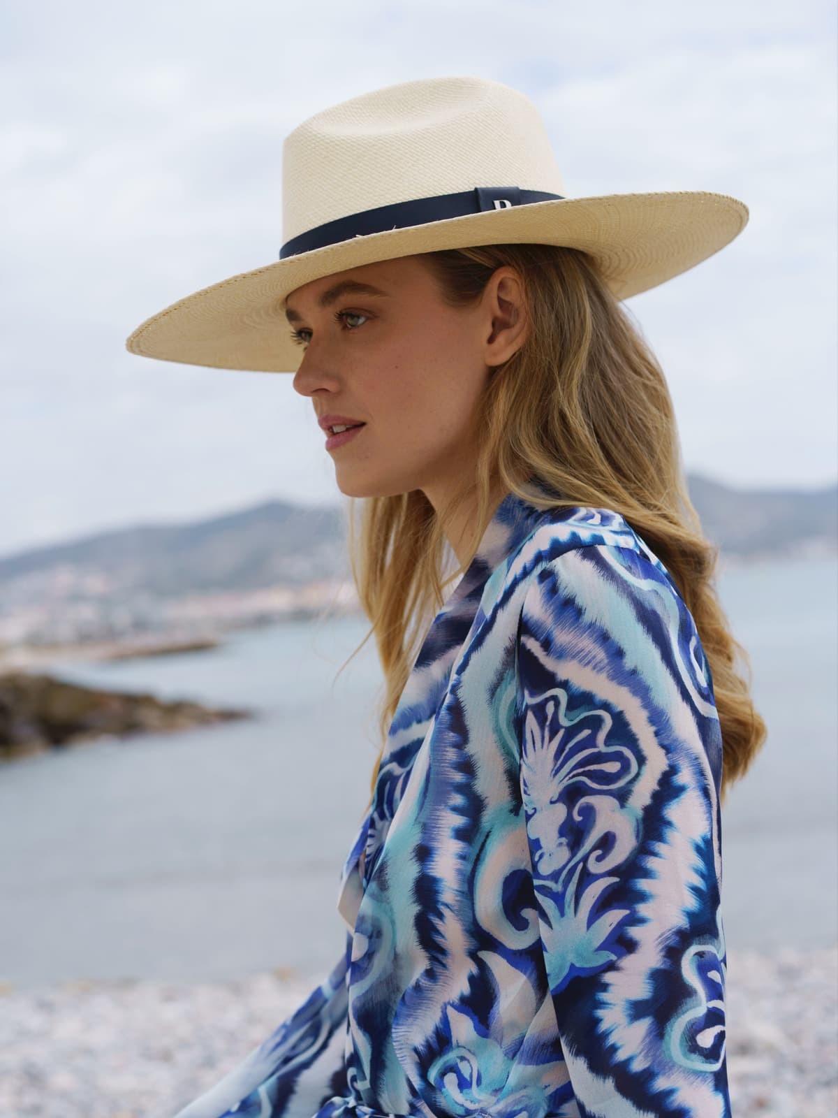 El Sombrero Panamá para mujer, en un hermoso color natural y ornamentado con una exquisita cinta de piel en azul marino, es la opción ideal para las mujeres que desean un estilo exclusivo y refinado.