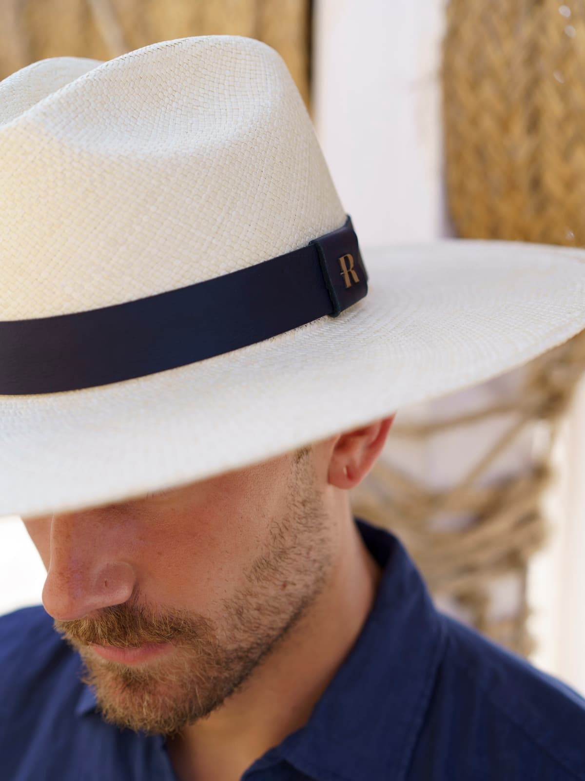 El Sombrero Panamá para hombre en color natural y decorado con una sofisticada cinta de piel en azul marino es la elección perfecta para aquellos que buscan un estilo único y distinguido.