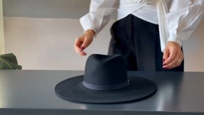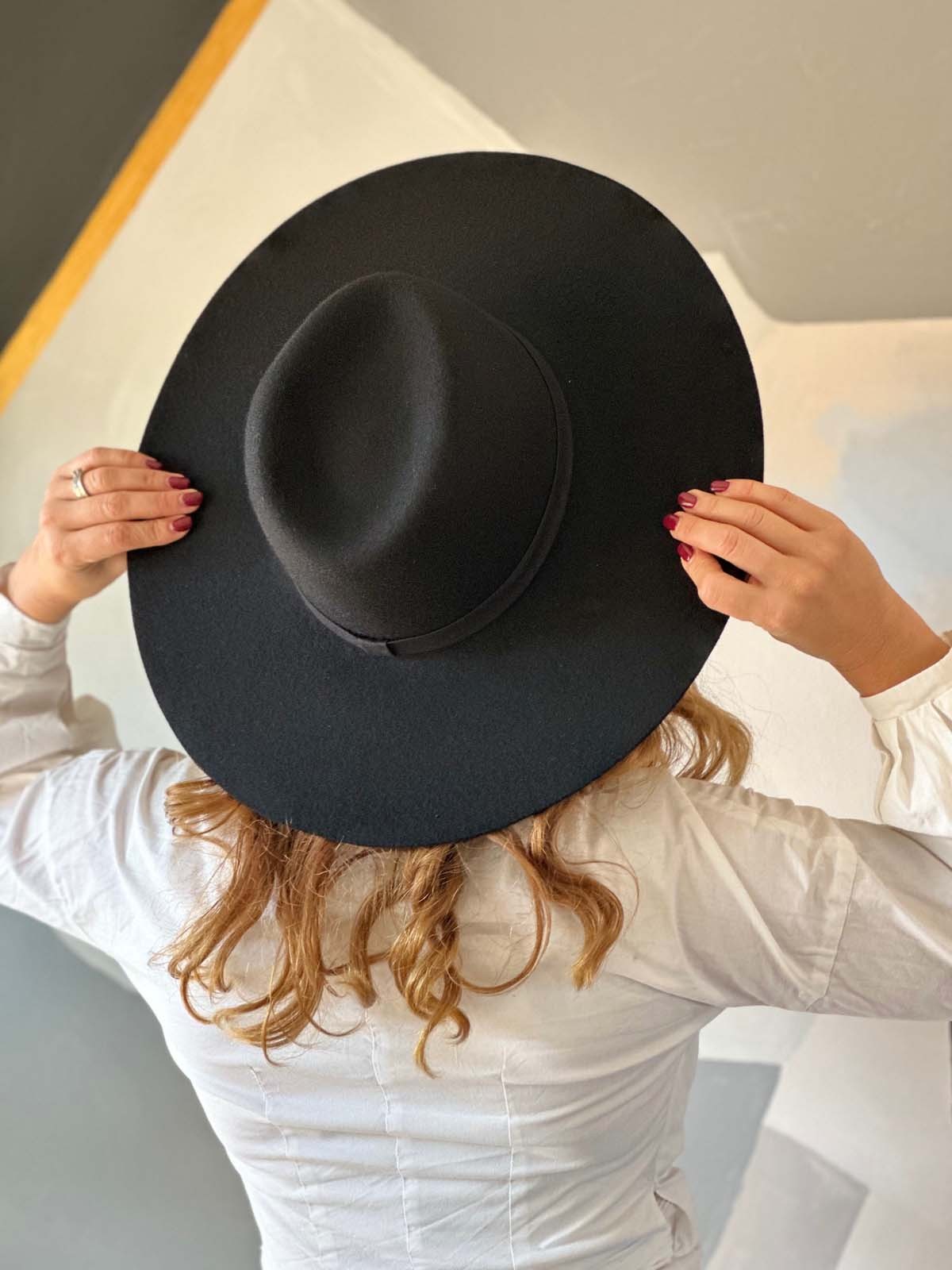 Crafted with 100% high-quality wool felt in a sophisticated black hue, the KIARA hat stands out for its wide and stiff brim that maintains its impeccable shape season after season.
