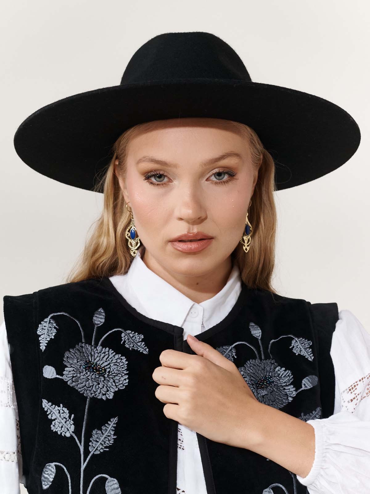 Hat made in 100% Wool Felt in Black, with Wide and Stiff Brim, adorned with fine cotton ribbon to tone and golden appliques.